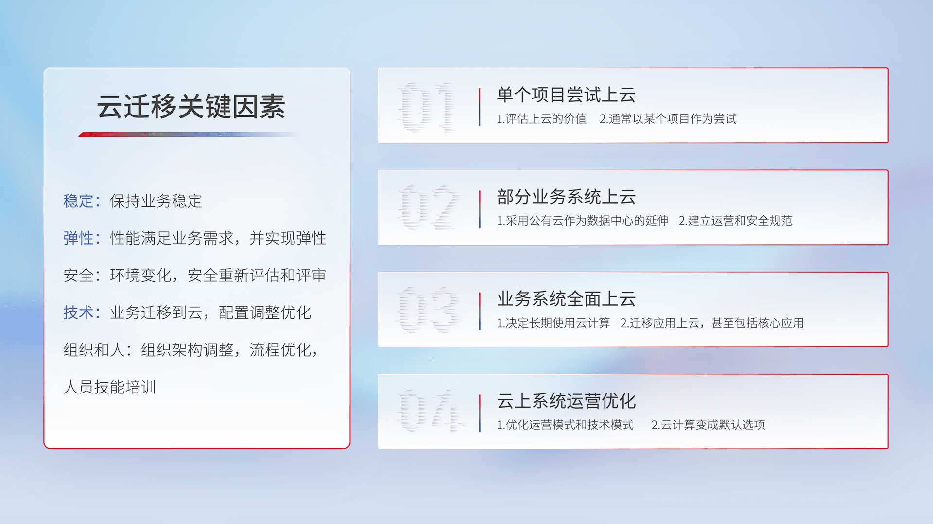 结合实际业务,,,,从规划设计、、、、云平台选型、、云原生改造、、、、数据迁移、、、集成交付,,,迁移全过程为客户识别最佳上云路径,,,,做好风险识别管理,,,设计网络架构、、、身份权限、、、安全审计合规、、操作审计、、、、日志审计、、、监控告警策略、、多站点容灾设计等,,,对云上基础设施进行整体规划,,,,提升IT治理水平,,以满足弹性、、、、高可用、、、高性能的需求。。