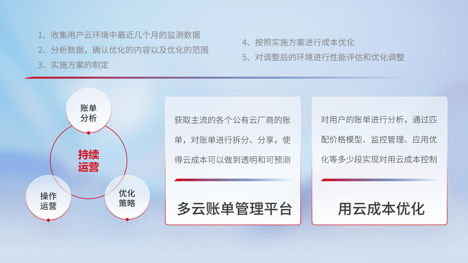 通过多云纳管,,,,以统一的资源数据模型把客户的云资源进行抽象和封装,,,,进而实现对多云资源的统一操作,,,保障云资源管理的可靠性、、、、稳定性与可用性。。。。量身定制化运维内容,,配置、、、、开发运维、、、、补丁管理、、、、备份、、、、监控、、、、认证和访问管理、、审计和日常巡检等,,保障在用云过程中的可靠度,,,,稳定度以及高可用率。。。。
